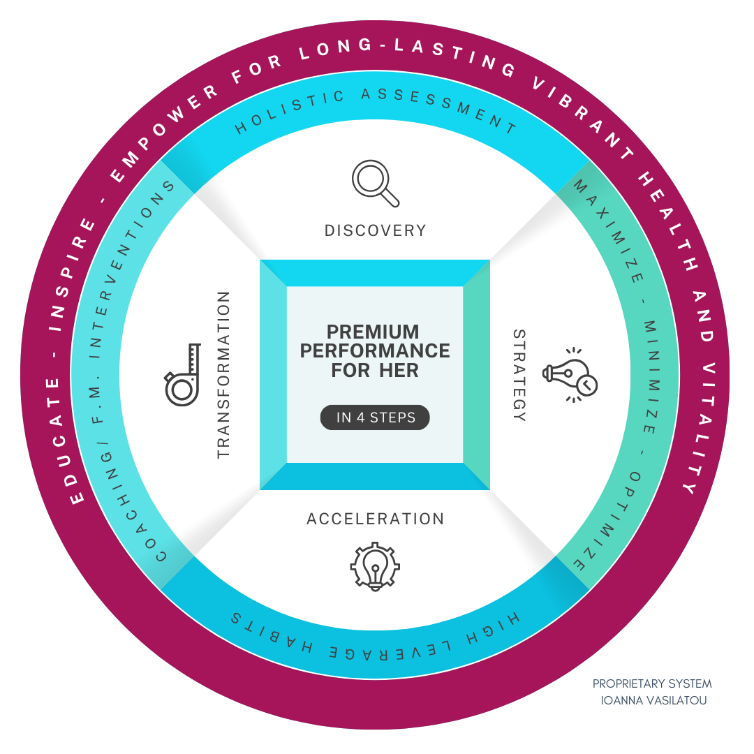Premium Performance For Her system goes from Discovery to Strategy, then Acceleration and finally Transformation in easy steps that fit the unique individual's life and pace and are proven to promote wellbeing and functional balance, as well as a rounded support to the emotional and mental fitness and health.